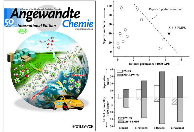 近年來(lái),MOFs材料因其在吸附、分離、催化等領(lǐng)域的巨大潛在應(yīng)用價(jià)值而成為世界各國(guó)研究者普遍關(guān)注的焦點(diǎn)。國(guó)際上,利用MOFs材料構(gòu)建分子篩分膜(根據(jù)分子的大小不同,優(yōu)先透過(guò)小分子),并用于氣體分子的尺寸選擇性分離的相關(guān)研究在近期取得了顯著進(jìn)展。然而,由于普遍存在的MOFs材料本身的骨架柔性,使得MOFs分子篩膜并不能有效地截留較其孔道直徑稍大的分子,限制了其在氣體膜分離領(lǐng)域的應(yīng)用。在本次報(bào)道中,該研究小組的科研人員正面地利用了MOFs材料(ZIF-8)的骨架柔性,實(shí)驗(yàn)觀測(cè)和理論模擬到異丁醇分子在ZIF-8納米粒子上吸附過(guò)程中的“gate-opening”效應(yīng)。基于該效應(yīng)和ZIF材料的表面超疏水性,制備出可以優(yōu)先透過(guò)醇類大分子而阻止尺寸更小的水分子的高性能ZIF-8納米復(fù)合膜。該膜可高效地從低濃度發(fā)酵液中富集異丁醇(第二代生物燃料),分離系數(shù)為34.9 - 40.1,透量為6.4 - 8.6 kgh-1m-2,超出了文獻(xiàn)報(bào)道的丁醇富集膜的性能上限。能耗分析表明,該ZIF-8復(fù)合膜的滲透汽化分離能耗僅為精餾能耗的一半,展現(xiàn)出良好的工業(yè)應(yīng)用前景。