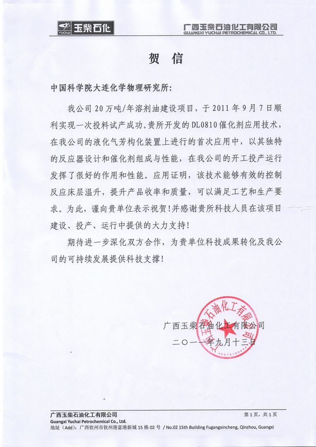 玉柴石化發來的賀信