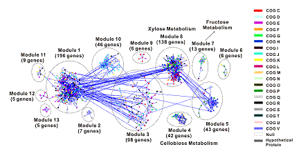 木質纖維素中除葡萄糖等己糖(六碳糖)外,還有大量的木糖等戊糖(五碳糖),目前大多數工業微生物只能或偏好于利用葡萄糖等己糖。青島生物能源與過程所徐健團隊與美國俄克拉荷馬大學周集中團隊合作,基于功能基因組與系統生物學手段重構了第一個嗜熱厭氧菌碳源代謝的代謝與調控網絡(如圖1)。該全基因組網絡揭示了葡萄糖、木糖、果糖和纖維二糖的分解代謝基因分別位于不同的功能單元內,并且己糖和戊糖的轉運系統都同受bglG調控,從而解釋了Thermoanaerobacter等嗜熱厭氧菌共利用己糖和戊糖的機制。