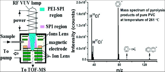 中科院大連化學(xué)物理研究所李海洋研究員領(lǐng)導(dǎo)的團(tuán)隊(duì)基于光電效應(yīng),利用商用的射頻VUV燈作為光源,成功研制了一種可以快速切換的高效的新型磁場(chǎng)增強(qiáng)的光電子碰撞電離(MEPEI)和單光子電離(SPI)復(fù)合電離源。將該復(fù)合電離源與飛行時(shí)間質(zhì)譜結(jié)合,實(shí)現(xiàn)了對(duì)難電離的無(wú)機(jī)化合物進(jìn)行了分析檢測(cè),產(chǎn)物離子無(wú)碎片,便于復(fù)雜樣品的譜圖解析。實(shí)驗(yàn)結(jié)果表明,利用800G的永久磁鐵,可以使SO2、SF6、O2和N2的離子信號(hào)強(qiáng)度增加2個(gè)量級(jí);同時(shí)對(duì)SPI的電離源的電離效率提高了2-3個(gè)量級(jí)。對(duì)苯和SO2的檢測(cè)靈敏度為80 ppbv和750 ppbv;用該電離源實(shí)現(xiàn)了復(fù)雜混合無(wú)機(jī)物的在線(xiàn)監(jiān)測(cè),并成功用于PVC熱裂解產(chǎn)物的在線(xiàn)分析、高壓絕緣開(kāi)關(guān)中SF6放電過(guò)程中的中間產(chǎn)物分析。另外,該電離源在在線(xiàn)分析復(fù)雜的二噁英前生體方面具有廣闊的應(yīng)用前景。該成果已經(jīng)刊登在美國(guó)化學(xué)會(huì)(Analytical Chemistry)上(http://pubs.acs.org/doi/pdfplus/10.1021/ac201791n)。