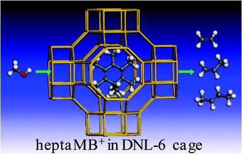 甲醇制烯烴是在酸性分子篩上進(jìn)行的多相催化反應(yīng),經(jīng)歷了一系列復(fù)雜的催化過(guò)程和反應(yīng)步驟。隨著反應(yīng)機(jī)理研究的不斷深入,烴池(Hydrocarbon Pool)機(jī)理得到了廣泛關(guān)注。然而,直接的實(shí)驗(yàn)證據(jù)仍然不足,特別是其中所涉及的重要反應(yīng)中間體七甲基苯基碳正離子(heptaMB+)及其去質(zhì)子化產(chǎn)物(HMMC)非常活潑,對(duì)其直接觀察十分困難,之前僅能通過(guò)間接方法和理論計(jì)算證明其在分子篩上可能形成,其在MTO反應(yīng)中是否真實(shí)存在及其在烯烴生成過(guò)程中如何發(fā)揮作用仍然存在疑問(wèn)。大連化物所DNL1201組研究人員在詳細(xì)研究了分子篩的結(jié)構(gòu)和酸性對(duì)MTO反應(yīng)機(jī)理影響的基礎(chǔ)上,利用該所DNL1202組近期合成的新型分子篩材料DNL-6的超大籠和強(qiáng)酸性的特點(diǎn),首次在真實(shí)MTO反應(yīng)體系中觀察到了heptaMB+/HMMC的存在,從而直接證實(shí)了烴池機(jī)理的合理性;更進(jìn)一步的工作利用13C同位素示蹤實(shí)驗(yàn)驗(yàn)證了該中間體在甲醇轉(zhuǎn)化中的重要作用和以此碳正離子作為中間體的烯烴生成途徑。這一發(fā)現(xiàn)為從反應(yīng)機(jī)理出發(fā)設(shè)計(jì)新的催化劑和調(diào)控產(chǎn)物中烯烴的選擇性提供了理論支撐。上述研究成果發(fā)表在《美國(guó)化學(xué)會(huì)志》上(