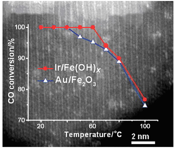 (J. Catal. 2008, 255, 144;J. Phys. Chem. C 2010, 114, 8533; Ind. Eng. Chem. Res. 2011, 50, 758; Chem. Eng. J. 2011, 168, 822; Nat. Chem. 2011, 3, 634),不僅開發了單原子鉑基高分散催化劑和新型銥基催化劑,而且還對這類催化劑上PROX反應機理進行了深入研究。前期研究發現載體中摻入氧化鐵物種可以大大提高催化劑活化氧氣的能力從而提高催化劑活性。在此認識基礎上,本研究采用特殊的氫氧化鐵載體提供活性氧或提高催化劑活化氧能力,成功制備了亞納米尺度(<1nm)高分散的Ir基催化劑,通過吸附量熱與原位紅外表征證明氫氧化鐵載體在提高催化劑活化氧的能力中具有顯著作用。與標準Au/Fe
