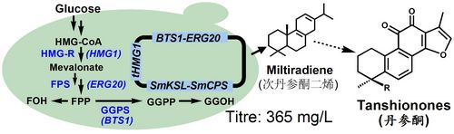 在楊勝利院士建議下,我所趙宗保研究員與黃璐琦研究員合作,以丹參酮為目標,開展合成生物學理念指導下的萜類化合物異源生物合成研究。科研人員建立了“模塊途徑工程”策略,可在酵母細胞中快速組裝代謝途徑。在此基礎上,通過設計模塊組合方式,系統(tǒng)考慮途徑中涉及的前體供給、限速步驟、底物傳輸和代謝流分配等問題,對編碼SmCPS、SmKSL、法呢基焦磷酸合酶、GGPP合酶和甲羥戊酸還原酶等五個蛋白的基因進行了操作,最優(yōu)的工程菌株在15-L發(fā)酵罐中培養(yǎng),次丹參酮二烯產(chǎn)量達到365mg/L的國際先進水平。