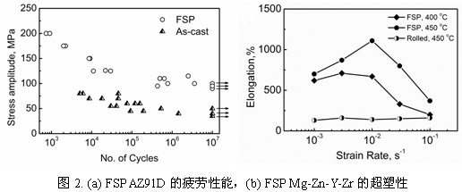 他們對高鋁含量的Mg-Al-Zn和稀土鎂合金進行了研究,發現FSP能夠破碎粗大的鑄態組織并導致動態再結晶;破碎粗大的網狀第二相粒子并使其大部分溶解;消除孔洞疏松等鑄造缺陷。1-2道次的FSP即可實現微觀組織重構,把粗大非均質鑄造組織轉變成細小、均勻、致密的鍛造組織(圖1)。尤其重要的是,FSP獲得的是等軸細晶結構的過飽和固溶體,并且具有高角晶界比率高、織構弱的特點,這是其它塑性加工手段無法實現的。人工時效后,FSP合金中析出彌散的第二相粒子,顯著提高了材料的力學性能。例如,對于鑄造AZ80鎂合金,FSP后的屈服強度、抗拉強度、延伸率較鑄態母材分別提高了63%、170%、510%;FSP+時效后,分別提高了130%、194%、315%。對于鑄造AZ91D,FSP后疲勞強度從45 MPa提高到105 MP(圖2a)。此外,FSP能夠實現鎂合金鑄件的缺陷修復,例如,對于Mg-Nd-Zn-Zr鑄件的10mm深縮松區,FSP修復后強度和塑性均高于無缺陷母材。