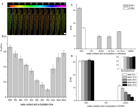 研究發(fā)現(xiàn)條斑紫菜干出失水時環(huán)式電子傳遞持續(xù)增強,致使PSI活性顯著上升;在嚴重失水時, PSI比 PSII有更強的耐受性,其原因為PSI驅(qū)動的環(huán)式電子傳遞的運轉(zhuǎn)。研究還表明,在復(fù)水過程中,PSI活性的恢復(fù)明顯快于PSII,主要源于葉綠體內(nèi)NDH介導(dǎo)的環(huán)式電子傳遞。對條斑紫菜性細胞尤其雄性細胞分化過程系統(tǒng)研究發(fā)現(xiàn),營養(yǎng)細胞和雄性細胞表現(xiàn)出相似的耐干出失水的生物學(xué)特性,表明營養(yǎng)細胞分化為精子囊的過程不受失水影響;條斑紫菜性細胞分化過程中PSII的實際量子產(chǎn)率Y(II)有顯著的增加,表明是為條斑紫菜精子細胞的形成和釋放提供物質(zhì)和能量的儲備。