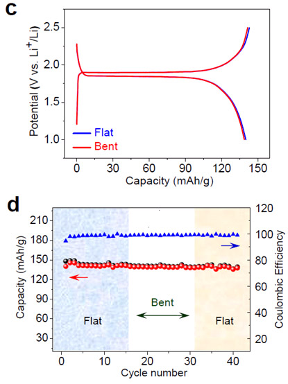 石墨烯具有高導電性和良好的柔韌性,是柔性儲能器件的理想候選材料之一。最近金屬研究所沈陽材料科學國家(聯合)實驗室在前期制備出具有三維連通網絡結構的石墨烯泡沫的基礎上(Nature Materials 10 (6), 424, 2011),利用該材料作為高導電的柔性集流體,設計并制備出可快速充放電的柔性鋰離子電池。研究人員將三維連通的石墨烯網絡作為集流體,取代電池中常用的金屬集流體,不僅可有效降低電極中非活性物質的比例,且三維石墨烯網絡的高導電性和多孔結構為鋰離子和電子提供了快速擴散通道,可實現電極材料的快速充放電性能。為了在不使用粘結劑和導電添加劑的情況下實現活性物質和石墨烯集流體的良好接觸以促進電子傳輸和提高彎折時電極材料的穩定性,研究人員發展了原位水熱合成方法,在石墨烯三維連通網絡結構上直接生長活性物質,如磷酸鐵鋰和鈦酸鋰。將磷酸鐵鋰/石墨烯和鈦酸鋰/石墨烯復合材料分別作為正負極,采用柔性硅膠為封裝體,組裝了具有很好柔性的鋰離子全電池(圖1a, b)。該柔性鋰離子電池在彎曲時,其充放電特性保持不變(圖1 c-d),并可在6分鐘內完成充電(達到初始容量的90%),在100次循環之后容量保持率在96%。