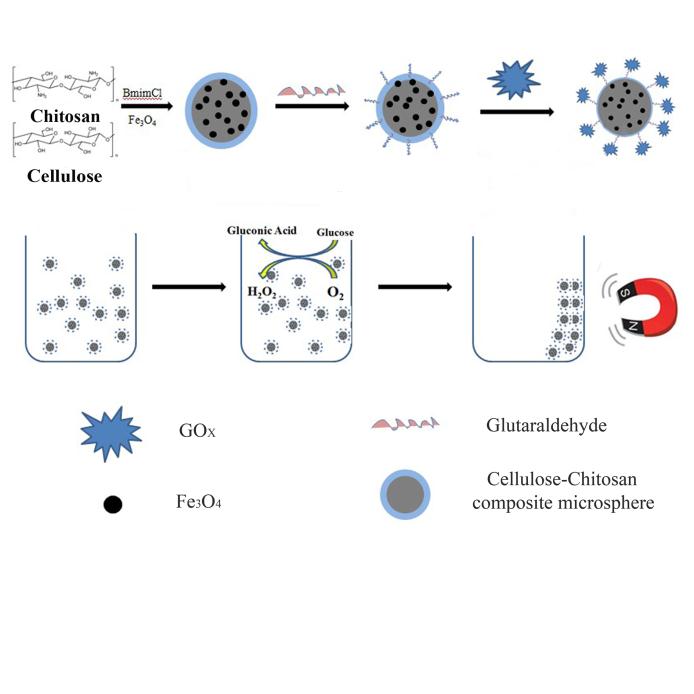 圖 2 纖維素微球用于葡萄糖氧化酶的固定化及重復利用過程示意圖
