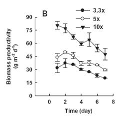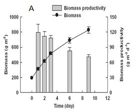 圖2. 產油柵藻的貼壁培養產率驗證(A:室內,B:室外)
