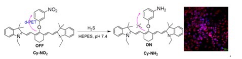 硫化氫 (H2S)是繼NO和CO之后的第三個氣體信號分子,可以快速穿過細胞膜,對一系列生物靶點產生作用,兼具細胞毒性效應和細胞保護作用。最近,該團隊利用H2S對硝基的還原性質,開發出一種含硝基功能團的近紅外熒光探針,用于H2S的檢測。在生理條件下,該探針有效避免了細胞自發熒光的影響,在水溶液和活細胞中均給予了積極的近紅外熒光信號響應,還成功拍攝到了活細胞內H2S濃度變化的實時圖像。參見:Chemical Communications, 2012, 48 (96), 11757–11759.