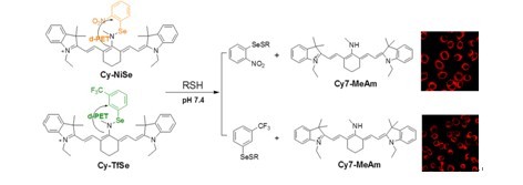 硫醇是生物體中許多蛋白質和小分子的重要組成部分,在細胞的抗氧化系統中具有重要的作用。大量的生物現象被認為依賴于這些包含巰基的硫醇類物質,如氧化還原反應、甲基轉移反應、二氧化碳固定反應以及輔酶A參與的反應等。最近,該團隊根據Ebselen在生物體內的代謝機理,設計合成了一類含硒功能團的近紅外熒光探針并將其用于活細胞和小鼠肝臟組織硫醇水平的檢測。參見:Chemistry - A European Journal, 2012, 18(36):11343–11349.