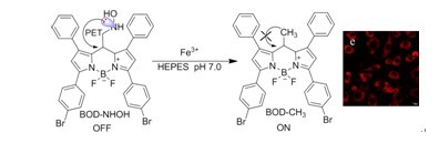 鐵是人體必需的微量元素,在氧代謝、電子轉移和轉錄調控中發揮著不可替代的作用。生物體內鐵的含量與健康狀況息息相關。由于鐵缺乏引起的缺鐵性貧血是全球性的疾病,但其發病機理尚不完全清楚。而糖尿病、癌癥和帕金森綜合癥等疾病的發生則與體內鐵過負荷密切相關。最近,該團隊根據三價鐵易被羥胺還原的特點,將羥胺基團“嫁接”到熒光團上,發展了一種基于羥胺氧化的氧化/還原型熒光探針用于三價鐵的檢測。這是首次利用羥胺的氧化實現細胞內鐵濃度的可視化熒光檢測。參見:Chemical Communications, 2012, 48 (43), 5310–5312.