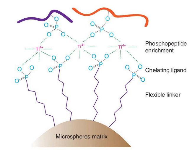 磷酸酯鋯或鈦表面與磷酸肽之間的高特異性相互作用示意圖