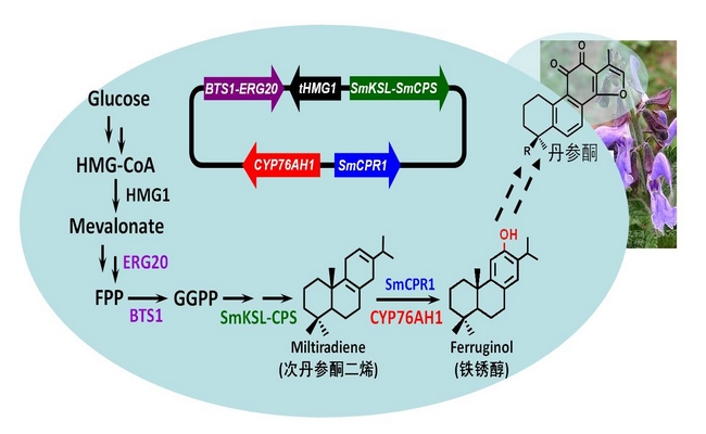 植物源萜類化合物具有廣泛生物活性,但依賴植物體的傳統生產方式是推廣應用的瓶頸之一。采用合成生物學策略,創制微生物“細胞工廠”,有望為植物源萜類化合物低成本、可持續供給提供先進技術。丹參酮為我國傳統中藥丹參的主要脂溶性活性成分,屬于松香烷類去甲二萜化合物。該研究組與中醫科學院中藥資源中心黃璐琦研究員課題組合作,前期構建了高產丹參酮合成前體次丹參酮二烯的酵母工程菌株(J. Am. Chem. Soc., 2012, 134(6): 3234)。中藥資源中心及合作者利用比較轉錄組學技術鑒定了14個與丹參酮積累相關的細胞色素氧化酶P450基因,并通過基因表達和體外酶活性篩選,發現CYP76AH1催化轉化次丹參酮二烯生成鐵銹醇??蒲腥藛T利用前期建立的“模塊途徑工程策略”快速組裝代謝途徑,構建酵母工程菌,優化前體供給、細胞色素還原酶匹配和宿主選擇等因素,搖瓶培養條件下鐵銹醇產量達到10 mg/L。此外,美國Iowa State University的Reuben J. Peters教授課題組,利用植物發狀根培養和C-13同位素標記技術,確定了次丹參酮二烯在丹參酮生物合成中的作用。本研究為丹參酮相關P450基因發掘、生物合成途徑解析和微生物生產奠定了基礎。