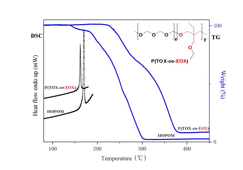 圖一 P(TOX-co-EOX)與均聚甲醛(HOPOM)的DSC及TGA曲線