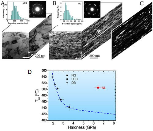 圖1. 表面機械碾磨處理在金屬鎳中形成的超細晶結構(A)和納米層片結構(B,C)。(D)為鎳中不同微觀結構的硬度與結構粗化溫度關系,納米層片結構(NL)兼具超高硬度和超高穩定性。