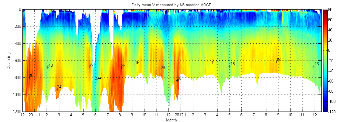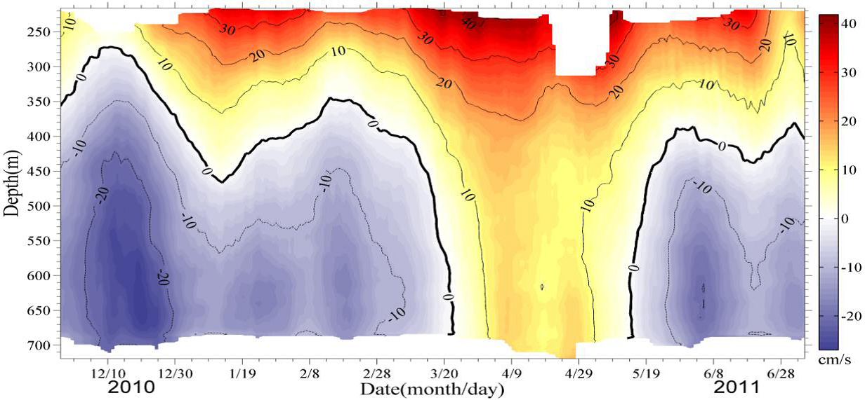 圖 1. ADCP 觀測到(約127.1 E, 8 N)的經向流速時間剖面(單位:cm/s,藍色為南向棉蘭老海流,黃紅色為北向棉蘭老潛流,橫坐標為從2010 年12 月始)。