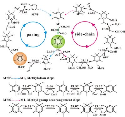 甲醇制烯烴國家工程實驗室多年來一直堅持應用研究與基礎研究并重,在甲醇制烯烴工業化過程開發和應用取得成就的同時,也致力于解決實際工業化開發過程中存在的基礎科學問題。甲醇制烯烴是在酸性分子篩上進行的多相催化反應,經歷了一系列復雜的催化過程和反應步驟。隨著甲醇轉化反應機理研究的不斷深入,烴池(Hydrocarbon Pool)機理得到了學術界的廣泛關注。其中關于反應中間物種碳正離子的觀測及其作用研究一直以來是一項非常重要且具有挑戰性的工作。在對具有大的超籠結構SAPO分子篩催化劑上生成七甲基苯碳正離子進行直接觀測后(J. Am. Chem. Soc.2012, 134 (2), 836–839),研究人員繼續對工業應用的CHA結構分子篩進行反應過程中碳正離子生成和作用的研究。首次在真實MTO反應條件下同時觀測到兩種碳正離子-七甲基苯碳正離子(heptaMB+)和五甲基環戊烯基碳正離子(pentaMCP+)的生成。其中五甲基環戊烯基碳正離子是首次在MTO反應中被發現,其結構的確認得到了固體核磁共振、GC-MS以及理論計算的證實。進一步的研究證明兩種碳正離子確實參與了MTO的轉化過程,從而直接證實了烴池機理的合理性。另一方面通過13C同位素示蹤實驗結合DFT理論計算,研究了碳正離子參與的兩種可能的催化反應路徑-side-chain機理和paring機理,證實在CHA分子篩上甲醇轉化兩種機理同時存在,side-chain機理占據主導地位。有關兩種碳正離子的穩定性與活性的關系在文中也做了比較和詳細的論述。上述研究成果發表在《德國應用化學》 (Angew. Chem. Int. Ed.2013, 52(44), 11564-11568)上。