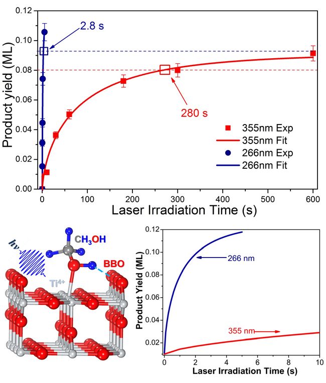 楊學(xué)明帶領(lǐng)的表面光化學(xué)反應(yīng)動(dòng)力學(xué)小組利用自行研制的基于高靈敏度質(zhì)譜的表面光化學(xué)裝置,系統(tǒng)地研究了單分子層甲醇覆蓋的TiO2(110)表面在紫外光照射后的反應(yīng)動(dòng)力學(xué)過(guò)程。早期結(jié)果(J. Am. Chem. Soc., 2012, 134 (32), 13366–13373,J. Am. Chem. Soc., 2013, 135 (28), 10206–10209)表明甲醇在光照過(guò)程中通過(guò)O-H鍵及C-H鍵的斷裂形成甲醛,解離出的大量氫原子轉(zhuǎn)移到旁邊的橋氧原子上。在表面升溫過(guò)程中,一部分氫原子會(huì)奪取表面的橋氧原子先以水(H2O)的形式從表面脫附出來(lái),產(chǎn)生表面氧空位。隨著表面氧空位濃度的增加,橋氧上剩余的氫原子則更容易結(jié)合成氫氣分子脫離。在本次的研究中,在波長(zhǎng)266 nm光照條件下,甲醇分子光致解離的量子產(chǎn)率比波長(zhǎng)355 nm光照產(chǎn)率高兩個(gè)量級(jí)左右,而TiO2對(duì)266 nm的吸收效率僅為355 nm的兩倍。這個(gè)實(shí)驗(yàn)結(jié)果表明光子能量(電子和空穴的能量)對(duì)光催化效率的有著重要的影響。一種可能的機(jī)理解釋是光激發(fā)產(chǎn)生的電子和空穴直接與甲醇分子作用,誘發(fā)了化學(xué)反應(yīng),而不是弛豫后再與甲醇分子作用誘發(fā)反應(yīng)。另外一種可能的解釋是光致激發(fā)產(chǎn)生的電子和空穴復(fù)合后生成高激發(fā)模式的聲子,其與甲醇分子耦合后激發(fā)分子的某些振動(dòng)模式,促使甲醇解離。如果能真正理解二氧化鈦表面光催化反應(yīng)發(fā)生的本質(zhì)機(jī)理,將會(huì)為設(shè)計(jì)與發(fā)展高效催化劑和完善光催化模型提供更好的支持。