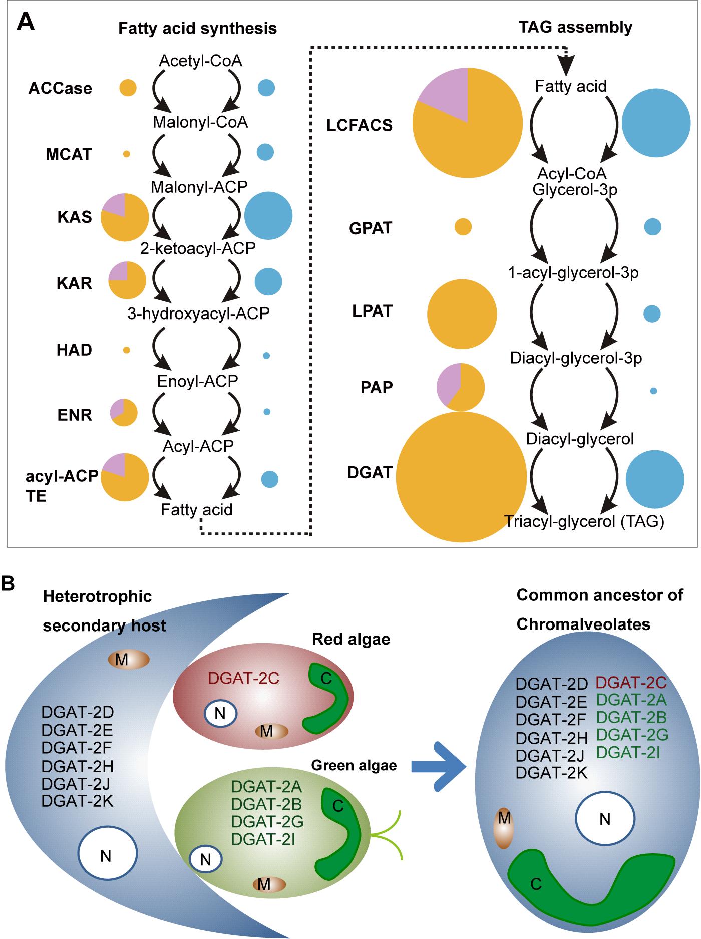 圖1. 微擬球藻中TAG合成途徑上的基因數(shù)膨脹以及其進(jìn)化來源。