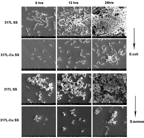 圖1 317L不銹鋼和317L-Cu不銹鋼分別與大腸桿菌(E. coli)和金黃色普通球菌(S. aureus)共培養6、12、24小時后,表面形成細菌生物膜的SEM形貌觀察。