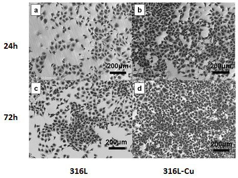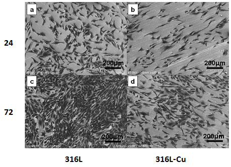 圖1分別為利用掃描電鏡對大腸桿菌和金黃色葡萄球菌在骨科植入常用的317L不銹鋼和317L-Cu含銅不銹鋼表面上的細菌生物膜形成過程的觀察結果。圖中大腸桿菌呈桿狀,金黃色葡萄球菌呈球狀。從圖2中可以看到,317L不銹鋼的表面上粘附有大量的細菌,并且隨著與細菌共培養時間的增加,細菌數量越來越多,形成的細菌生物膜面積和厚度越來越大。當時間達到24h時,可以看到317L不銹鋼表面上形成的細菌生物膜已經呈現多層立體結構。然而,317L-Cu不銹鋼表面上的細菌數量非常稀少,其隨意和零星地分布在不銹鋼表面上,而且即使增加與細菌的共培養時間,也沒有發現形成細菌生物膜。由此可見,由于含銅不銹鋼具有的強烈和廣譜殺菌功能,因此能夠有效抑制在其表面上形成細菌生物膜。