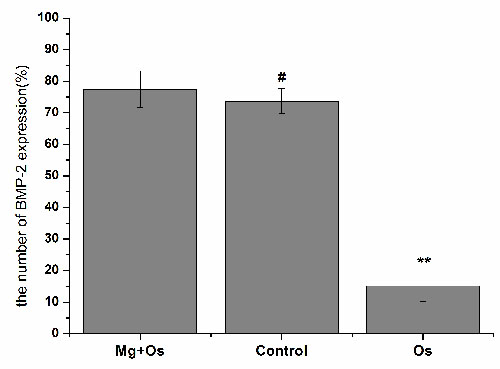 圖3 不同實驗組的BMP-2表達,Mg+Os = 在骨質疏松模型大鼠中植入鎂合金4周,Control = 正常大鼠對照,Os = 骨質疏松模型大鼠