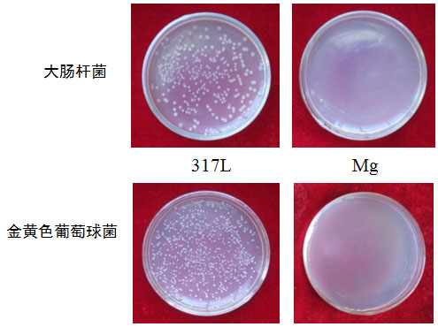 圖4 317L不銹鋼和純鎂分別與大腸桿菌、金黃色葡萄球菌共培養后的殺菌效果照片