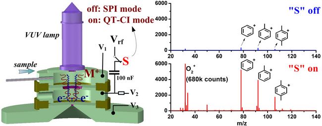 研究人員利用真空紫外光的光電效應,真空紫外光照射在金屬電極上產生光電子,利用電場調制光電子的能量使其電離氧氣得到試劑離子O2+,利用O2+與樣品進行電荷轉移反應電離樣品得到化學電離源,在電離源中施加射頻場,射頻場作用下離子運動路徑更長,大幅增加了試劑離子與樣品的碰撞幾率,提高了分子離子反應效率,從而得到更高電離效率。實驗結果表明,與單光子電離方式相比,對13種分析物(包括芳香烴,氯代烴,硫化氫等)的檢測靈敏度提高了12-118倍。并且,以O2+作為試劑離子,實現了電離能高于10.6 eV的有機物的分析,如丙烷、1,2-二氯乙烷、氯仿等多氯烷烴。