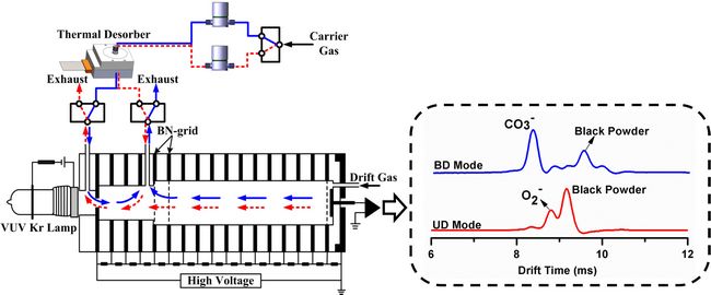 該團(tuán)隊(duì)發(fā)現(xiàn)不同反應(yīng)試劑離子和爆炸物反應(yīng)會(huì)形成不同的產(chǎn)物離子和特征譜圖。通過(guò)簡(jiǎn)單的氣流切換實(shí)現(xiàn)了非放射性摻雜劑輔助負(fù)離子光電離源中兩種反應(yīng)試劑離子CO3-和 O2-的快速切換,切換時(shí)間小于2s。將這種電離源和離子遷移技術(shù)相結(jié)合,用于典型爆炸物三硝基甲苯、黑索金、硝銨和黑火藥的檢測(cè),實(shí)驗(yàn)結(jié)果表明:兩種反應(yīng)試劑離子的快速切換能夠為爆炸物的準(zhǔn)確鑒定提供更多信息,有利于降低誤報(bào)率,增強(qiáng)鑒定準(zhǔn)確性;另外,也可以改善和產(chǎn)物離子的峰-峰分離度、增強(qiáng)檢測(cè)靈敏度和擴(kuò)展可檢測(cè)爆炸物的范圍。