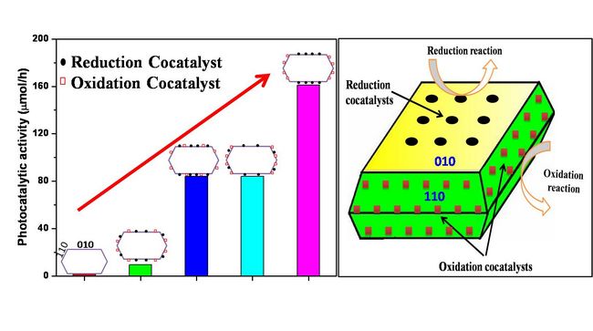 基于前期發現的半導體光催化劑的不同晶面之間光生電荷分離效應,本工作將不同的氧化和還原雙助催化劑分別高選擇性地擔載到光催化劑BiVO4的(110)和(010)不等同晶面上,將光催化氧化水的活性提高兩個數量級以上。研究發現:分別只擔載一種助催化劑時,可將活性提高到一定程度,只有當雙助催化劑選擇性地擔載于特定晶面時才會表現出明顯的協同促進作用,使光催化氧化水反應活性大幅度提高。將這一策略制備的光催化劑用于光催化氧化降解多種污染物的反應中也同樣發現可以顯著提高光催化反應活性,進一步確認了雙助催化劑在不同晶面選擇性擔載的協同促進光催化反應的機制,從而為理性設計合成半導體基光催化體系以實現高效光催化分解水提供新的策略。