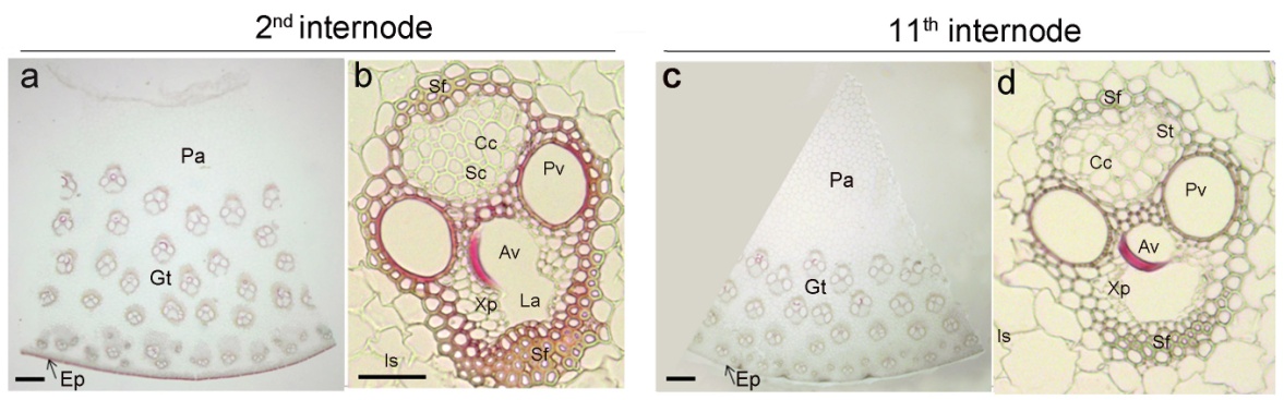 周功克等在研究中發(fā)現(xiàn),結(jié)晶化纖維素與木糖是南荻莖細胞中分布最廣的多糖,兩者在除韌皮部之外的區(qū)域均有大量分布,且在不同發(fā)育時期的莖中具有相似的分布特點。韌皮部主要存在的多糖是木葡聚糖。而果膠質(zhì)多糖則在南荻的莖細胞中,尤其是維管束區(qū)域,其分布呈現(xiàn)多樣性。該研究同時鑒定到長鏈阿拉伯聚糖,半乳糖醛酸,巖藻化木葡聚糖等在不同發(fā)育時期的莖中分布形式具有很大差異。