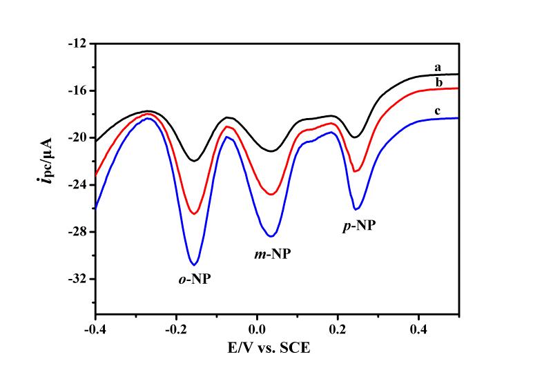 p-NP, m-NP 和 o-NP濃度分別為(a)10 M,(b)20 M,(c)30 M。DPV測定參數(shù):平衡時間,2s; 電位幅度, 50 mV; 脈沖周期,0.5s; 階躍高度, 4 mV; 頻率, 60 Hz