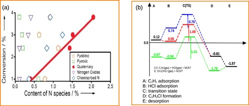 研究表明在碳納米管催化劑中摻雜氮原子是催化劑優異催化活性的關鍵。通過氮摻雜,碳納米管催化劑表現出了和傳統金屬催化劑(例如銅)相近的催化能力,摻氮碳納米管的反應轉換頻率高達2.3 10-3 s-1,具有很好的工業應用潛力。更為重要的是摻氮碳納米管催化劑還具有優異的穩定性,而在長時間反應條件下大部分金屬催化劑都表現出了催化活性的大幅降低,因而碳材料催化劑的穩定性是保證未來工業上應用的關鍵。通過比較不同氮物種的作用,發現季氮物種的含量和反應活性呈現較好的正比例關系。結合密度泛函理論計算,證明了季氮物種是主要催化活性位點。更進一步的理論計算揭示了在碳材料催化劑上的反應路徑,證明乙炔吸附是反應中最重要的步驟,摻雜氮原子增強了乙炔分子在活性位上的吸附,進而提高了催化活性。通過電子結構分析發現了乙炔分子在碳材料上的吸附機理和在金屬催化劑上的是截然相反的。這是因為氮摻雜改變了催化劑的酸堿性從而影響了反應分子和催化劑之間的作用形式。這些研究成果表明納米碳材料作為一類重要的非金屬催化劑材料具有廣闊的應用前景,并且為高效、綠色生產聚氯乙烯開辟了新的研究方向。