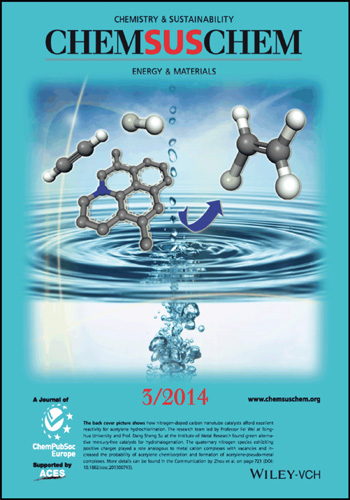 近期,金屬所沈陽材料科學國家(聯合)實驗室催化材料研究部李波副研究員、蘇黨生研究員和清華大學魏飛教授研究小組合作發現,摻雜氮的納米碳材料對乙炔氫氯化反應具有顯著的催化活性,該工作作為雜志封底文章發表在ChemSusChem上(2014, 7, 723-728),同時MaterialsView China(http://www.materialsviewschina.com/2014/04/lv-yi-xi-lv-se-he-cheng-ti-dai-gong-di-chan-dan-tan-cui-hua/)對于這項研究成果進行了專題報道。