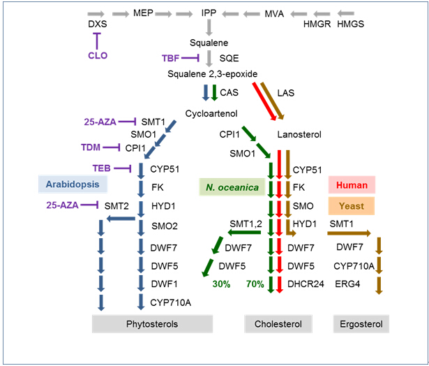 圖1. 微擬球藻甾醇合成途徑,及其與哺乳動物、高等植物和酵母的聯系和區別