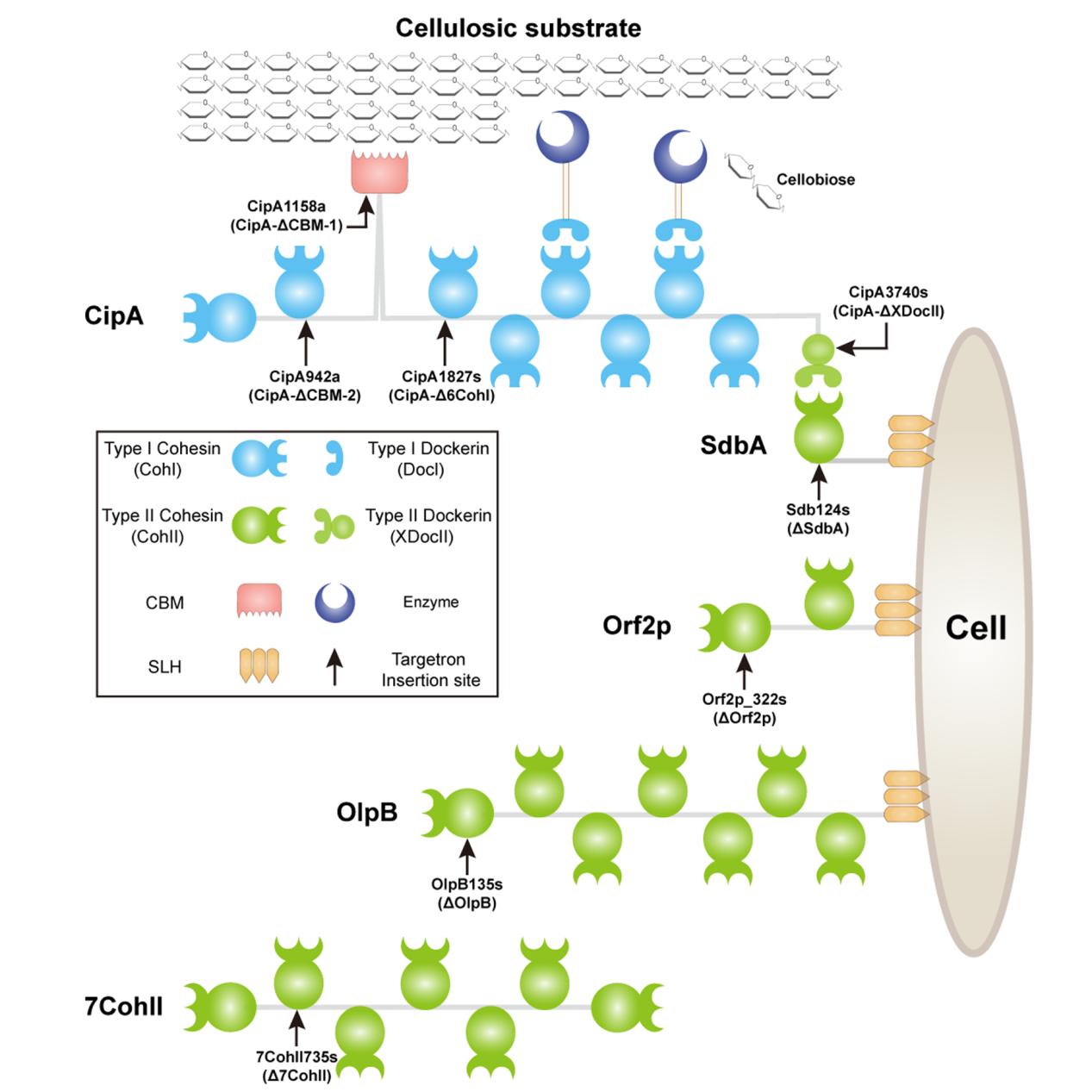 由于纖維小體的復雜性和熱纖梭菌遺傳操作手段的缺乏,纖維小體中不同水平的相互作用及協(xié)同效應在纖維素降解過程中的貢獻仍不清楚。研究人員利用前期開發(fā)的thermotargetron遺傳操作技術(Mohr G, Hong W, et al, PloS One 8(7):e69032),構建了一系列腳架關鍵模塊缺失的熱纖梭菌突變株(圖1),通過測定和分析突變株的纖維素降解速率、纖維小體形態(tài)以及纖維素底物結合率的變化,定量分析了不同腳架蛋白及其模塊對纖維小體的纖維素降解活性的貢獻。