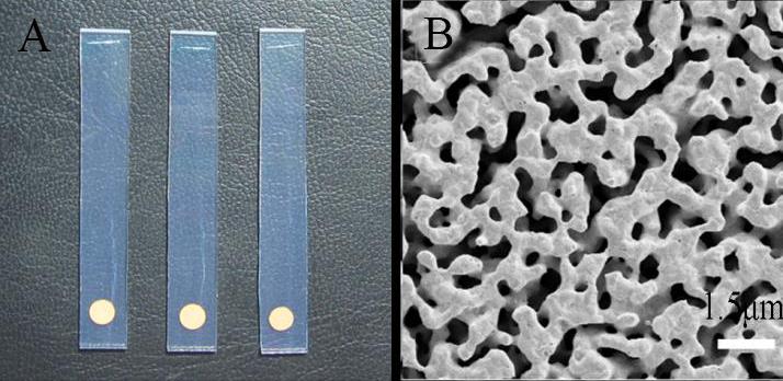 圖1. 三維多孔結(jié)構(gòu)金膜的照片。(A)金膜在FTO上的光學(xué)照片;(B)金膜的掃描電鏡照片。