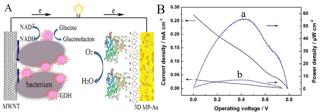 圖2. (A)生物燃料電池示意圖,生物陽極為bacteria-GDH/聚亞甲基藍(lán)/多壁碳納米管/玻碳電極,生物陰極為漆酶固定的三維多孔金膜。(B)電池功率密度隨輸出電壓的變化曲線。a,生物陰極為漆酶固定的三維多孔金膜;b,生物陰極為圓盤金電極。