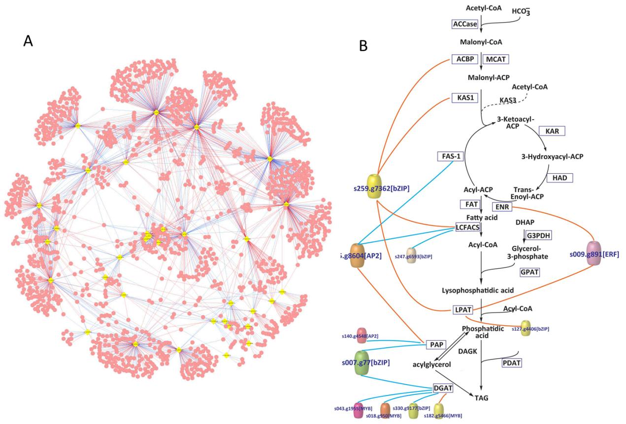 圖1:(A) 計算方法預(yù)測的微擬球藻全基因組轉(zhuǎn)錄調(diào)控網(wǎng)絡(luò),黃點代表轉(zhuǎn)錄因子,紅點代表靶基因。(B) 甘油三酯(TAG)合成途徑的轉(zhuǎn)錄調(diào)控網(wǎng)絡(luò),彩色圓柱體代表轉(zhuǎn)錄因子,紅線代表正調(diào)控,藍線代表負調(diào)控