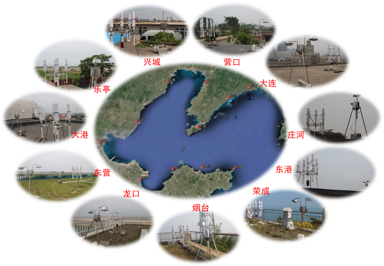 該觀測網絡北起位于鴨綠江口的東港,南至山東半島東端的成山頭,包括東港、莊河、大連、營口、興城、樂亭、天津、東營、龍口、煙臺和榮成,共11個大氣沉降觀測站。每個站點包括一臺有機污染物沉降采樣器和一臺生源要素/重金屬采樣器。此觀測網絡的構建與長期數據積累對認識渤海—北黃海陸源物質的大氣沉降輸入通量及其時空演變規律具有積極意義。