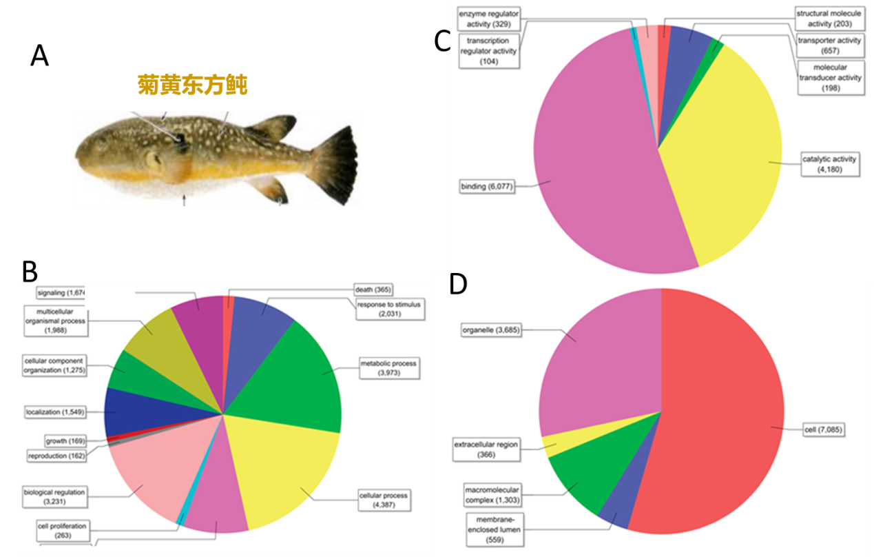 菊黃東方鲀俗稱“滿天星”(圖A),隸屬鲀形目、東方鲀科,在亞洲有著悠久的食用歷史和極高的經(jīng)濟(jì)價(jià)值,也是我國(guó)重要的河鲀養(yǎng)殖品種之一。科研人員依托中科院海洋所自主構(gòu)建的海洋生物基因資源平臺(tái)和超算平臺(tái)獨(dú)立完成了菊黃東方鲀(Takifugu flavidus)全基因組的測(cè)序、拼裝及分析,利用SOLiD 4第二代高通量測(cè)序儀測(cè)序得到總長(zhǎng)度76.0 Gb的序列,并創(chuàng)新性地采用“輔助拼接”策略拼接獲得scaffolds 50,947條(scaffold N50為305,741 bp)。研究發(fā)現(xiàn)菊黃東方鲀基因組在GC含量和重復(fù)序列等多方面與紅鰭東方鲀基因組相似,菊黃東方鲀基因組中共有30,285個(gè)蛋白編碼基因,蛋白平均長(zhǎng)度為519.9個(gè)氨基酸,獲得51,990條GO注釋信息(圖B~D),117 條KEGG通路信息和270,803條InterPro注釋信息。