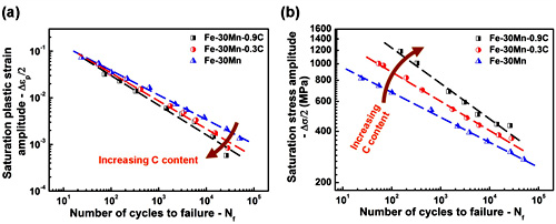 圖1. Fe-Mn-C鋼的疲勞壽命曲線:(a)塑性應變幅-壽命曲線(Coffin-Mansion公式);(b)應力幅-壽命曲線(Basquin公式)。采用應力與應變作為參數評價材料的疲勞壽命表現出相反的趨勢