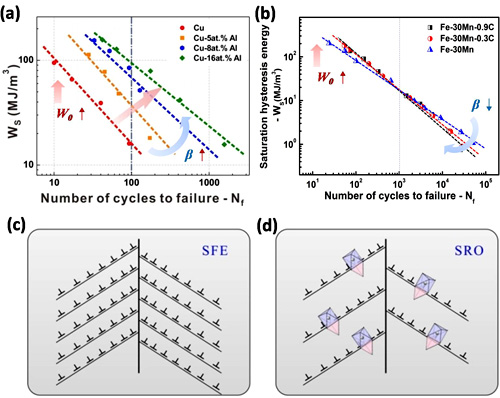 圖2. 滯回能模型的應用:(a)Cu-Al合金能量-壽命曲線;(b)Fe-Mn-C鋼能量-壽命曲線;層錯能(SFE)和短程有序(SRO)對(c) Cu-Al合金微觀變形機制與(d)Fe-Mn-C鋼微觀變形機制影響示意圖