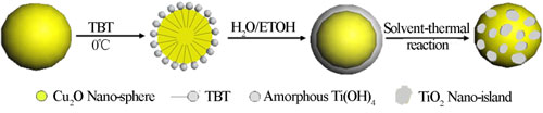 圖1 二氧化鈦“納米島”修飾的氧化亞銅納米球光催化材料的合成路線圖。
