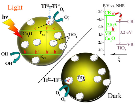 在前期工作的基礎上,他們通過對光催化“記憶”效應機制與有效活性基團的研究,近期在光催化“記憶”效應研究上取得了重要進展。他們發現,貴金屬修飾不是光催化“記憶”效應所必需。根據半導體材料的能帶結構,通過選擇具有電子存儲能力的材料,進行適當的材料結構與能帶的匹配,可以在多種光催化納米材料體系中實現光照下光生電子的富集、存儲與光照關閉后的釋放,從而獲得性能更為優異、成本更低的具有“記憶”效應的高效光催化凈水材料。在此機制研究成果的指導下,他們研發出第二代具有“記憶”效應的光催化材料——二氧化鈦“納米島”修飾的氧化亞銅納米球光催化材料。在合成氧化亞銅納米球的基礎上,通過吸附、控制水解與溶劑熱反應在氧化亞銅納米球上生成非連續的二氧化鈦“納米島”。在此材料體系中,p型氧化亞銅納米球上構筑了n型二氧化鈦“納米島”,形成納米p-n結結構。p型氧化亞銅納米球可以吸收可見光,產生電子-空穴對。二氧化鈦納米島的導帶能級低于氧化亞銅納米球的導帶能級,光生電子能夠從氧化亞銅轉移到二氧化鈦;同時界面形成的納米p-n結產生的內建電場也促使光生電子從氧化亞銅轉移到二氧化鈦,從而更加有效分離電子-空穴對。在實現有效分離電子-空穴對的同時,二氧化鈦納米島上的Ti4+可被還原為Ti3+而進行光生電子(即光能)的存儲;在光照關閉后,通過釋放電子產生超氧與羥基活性基團,產生光催化“記憶”效應(ACS Applied Materials & Interfaces, 2014, 6, 5629)。
