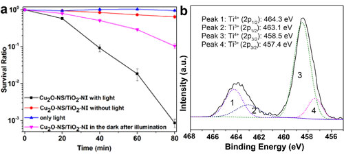 圖3 (a) 大腸桿菌僅在可見光光照下(藍色)、被Cu2O/TiO2樣品在黑暗中(紅色)、光照下(黑色)、以及事先光照3小時后再在黑暗中處理(玫紅色)后的存活率;(b) 可見光照下,Cu2O/TiO2樣品的XPS高分辨Ti 2p譜。