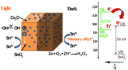 圖5 Cu2O/SnO2 p-n結結構、能帶匹配示意圖與光催化“記憶”效應原理圖。