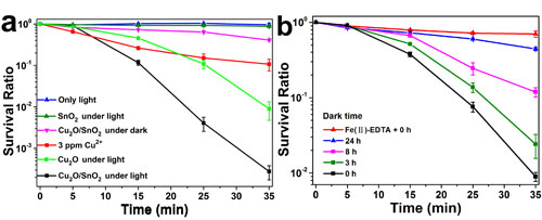 圖6 (a)光照條件下金黃色葡萄球菌在Cu2O/SnO2樣品光催化殺菌等處理方式下的存活率;(b) 光照關閉后,金黃色葡萄球菌在黑暗中放置不同時間后Cu2O/SnO2樣品處理后的存活率。