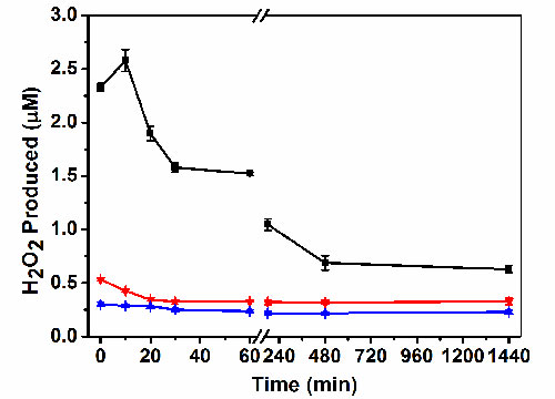 圖7 光照關閉后,Cu2O/SnO2樣品(黑色)、Cu2O 納米單晶(紅色)與SnO2 納米顆粒(藍色)黑暗中在測試溶液中產生雙氧水的濃度。