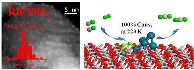 中國科學院大連化學物理研究所王曉東研究員和張濤院士領導的研究團隊長期致力于高分散金屬催化劑的研究與開發,近期取得重要進展,首次制備出TiO2負載的亞納米Rh催化劑并發現該催化劑能夠在-50oC實現CO的完全氧化,首次實現了鉑族金屬在超低溫下CO的催化氧化。該工作獲得了審稿人一致的高度評價,被認為是里程碑式的工作,以VIP(top 5%)形式發表于Angew. Chem. Int. Ed.上,并被推薦為后封面文章。